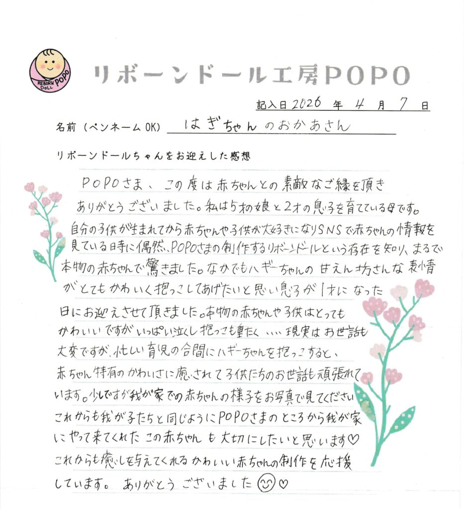 私たちリボーンドール工房POPOの職人たちは、日本の皆様にリボーンドールの愛らしさを知ってもられるよう日々制作に励んでおります。完全手作業のため時間もかかり、既製品のような完全完璧な仕上がりではないかもしれませんが、抱っこした時に温かい気持ちになっていただけるよう、日々心を込めて制作しております。